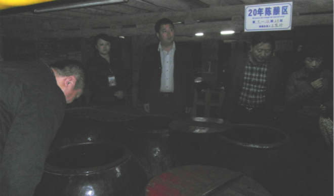 在參觀完紅酒發(fā)酵過程后周處長一行人來到了我們的窖藏車間,一進(jìn)地窖撲香而來的醋味和數(shù)量眾多的窖缸讓周處長等領(lǐng)導(dǎo)嘖嘖稱奇。公司講解員詳細(xì)介紹了窖藏車間的由來及釀造技藝。“永春老醋窖藏車間始建于1953年,為永春釀造廠創(chuàng)始之時(shí),模擬民間家傳老醋的釀制條件而建。主體為木質(zhì)結(jié)構(gòu)樓房,底層為半地下室環(huán)境終年恒溫恒濕;所有的醋缸都是當(dāng)時(shí)從民間收集而來,數(shù)量超過3000個(gè),至今已有五十多年的歷史。像這樣采用陶制醋缸在半地下室的環(huán)境中按照傳統(tǒng)工藝釀醋的在全國只有永春老醋一家,其他老醋即使有醋缸也用純手工釀造,但他們都沒有這種半地下室的發(fā)酵環(huán)境。所以永春老醋的窖藏車間是全國唯一獨(dú)有的。采用陶制醋缸有利于微生物菌群的生長,恒溫恒濕的環(huán)境更能使醋酸菌充分發(fā)酵,再加上分期分批添加紅曲酒到不同的醋缸轉(zhuǎn)酸,不同年份的醋缸逐年交替分割去醋的陳釀方法以及每天專人純手工地?cái)嚢?、分割和補(bǔ)料方式。從而形成了永春老醋秉承傳統(tǒng)釀造工藝的獨(dú)到優(yōu)勢,所以永春老醋歷經(jīng)數(shù)十年流轉(zhuǎn)陳釀,酸香醇厚,品味精絕,乃醋中極品,值得典藏。.jpg)