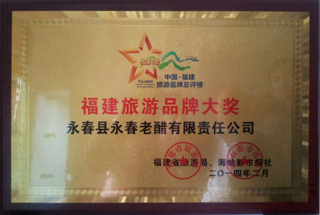 永春老醋公司作為福建工業(yè)旅游示范點的典型企業(yè),2014年2月成功獲評為“2013中國(福建)旅游總評榜”中的“旅游品牌大獎”。“中國旅游品牌總評榜”被譽為中國旅游界“奧斯卡”金獎,是中國旅游界唯一的權威品牌評價體系。獲此殊榮,是各相關部門、媒體及社會大眾對“中國南派醋業(yè)代表——桃溪永春老醋”的認可和支持,我們?nèi)w老醋人備受鼓舞。今后,我們將一如既往,戒驕戒躁,以爭創(chuàng)“全國工業(yè)旅游示范點“為目標,全力開發(fā)獨具工業(yè)旅游特色的全新產(chǎn)品,引領工業(yè)旅游消費時尚,打造游客信賴品牌。
